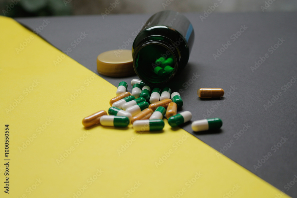 Fármacos representados en capsulas o comprimidos para curar enfermedades que dañan la salud.