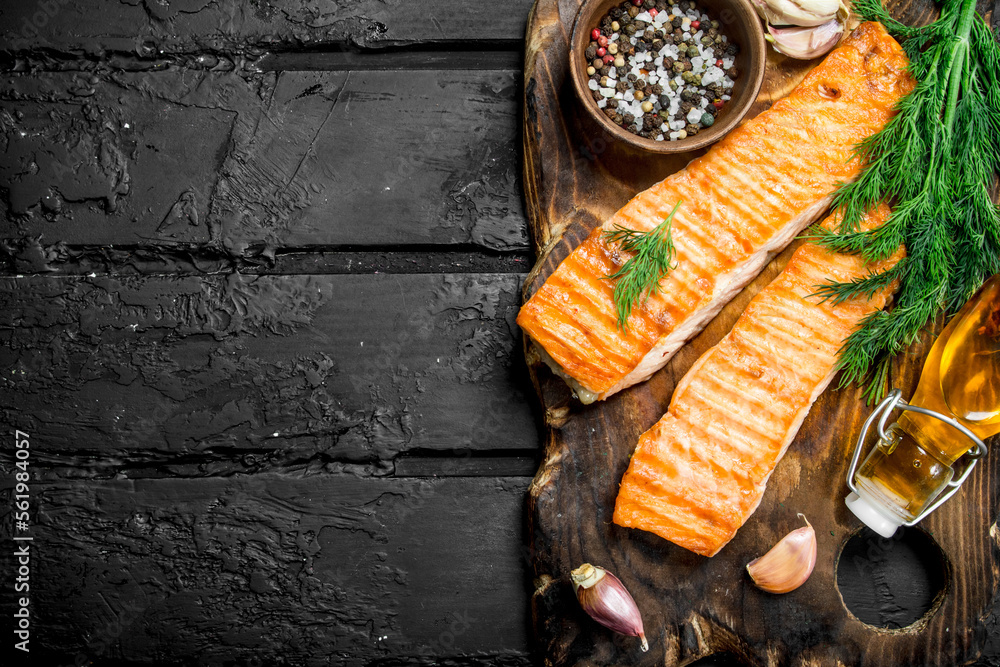 Smoked salmon slice on wooden board