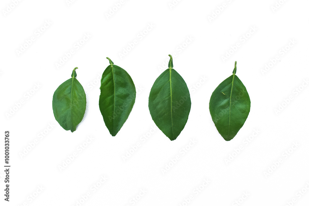 wet green leaves isolated on white background, top view, Mandarin leaf, Citrus leaves on white. Orange, lemon, lime, tangerine leaf isolated. Leaf set top view. Leaves flat lay. With clipping path.