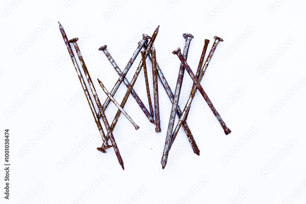 A small pile of rusty nail isolated on a white background. they are old, but still can be used for work. with line and hash tage 1inches and other size iron nail with old Pile of metal nails on white