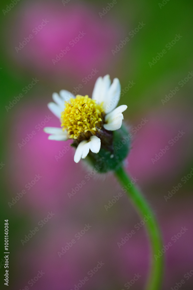 Close-up of a single delicate white wildflower with a yellow center and soft petals, set against a blurred pink and green background