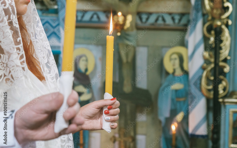 Close-up of people holding lit candles in church, with lace veil and religious icons in the background