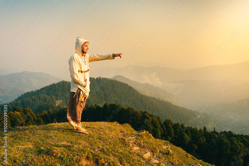 The man standing on a mountain top against a beautiful Sunset, Raghupur Fort, Jaroli Pass, Himachal Pradesh, India.