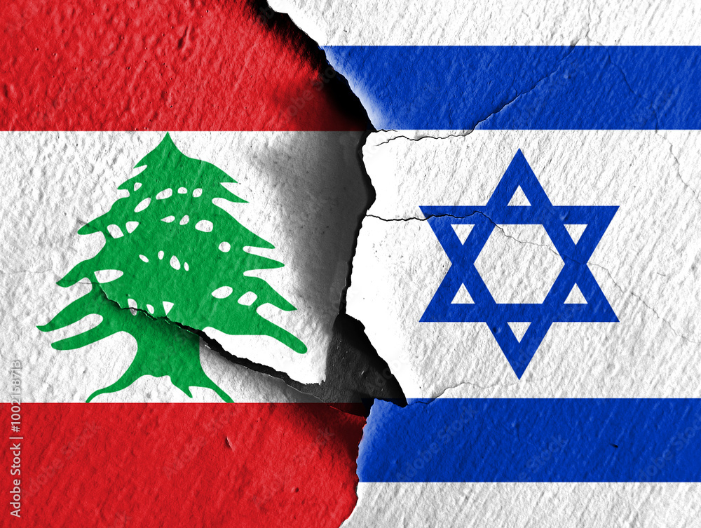 The Israeli flag and the Lebanese flag are both made from textures. Concept illustration depicting the conflict war between Lebanon and Israel. double exposure hologram