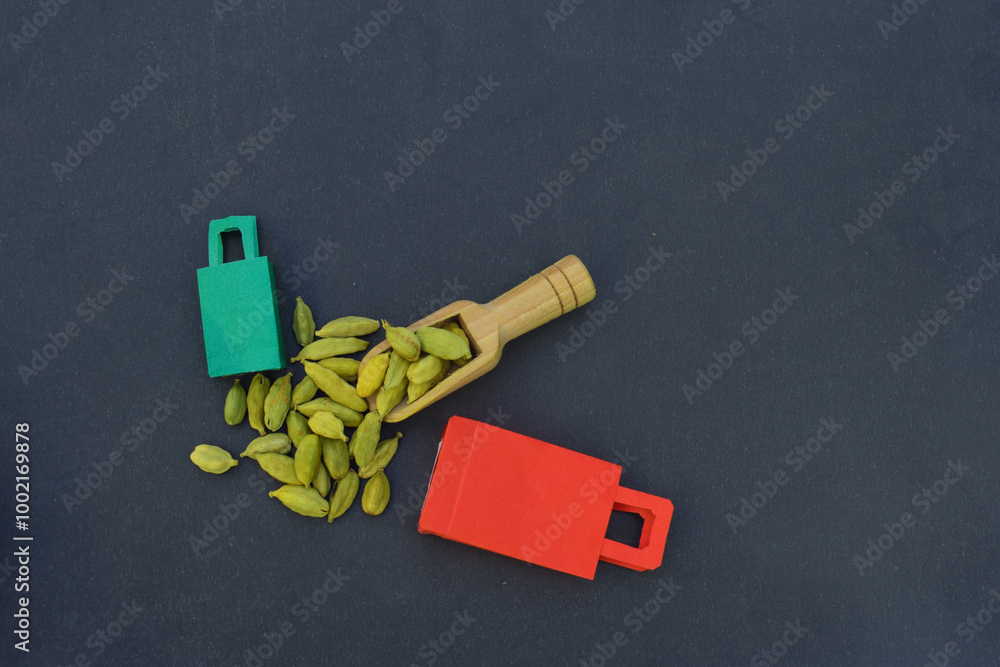 Pile of cardamom or spice Dried seeds, on back background. green leaf and wooden spoon and shopping bag red and light green,Green Cardamon Seeds, Dry Kardamon, Cardamum Spice