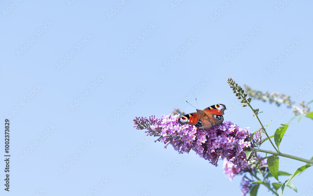 A red butterfly, a peacock butterfly, sits on purple summer lilacs. The animal and the flower protrude into the picture from below. In the background there is plenty of space for text in the sky.