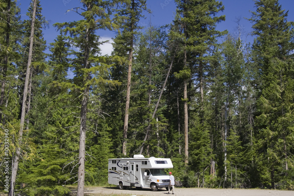 Big Motorhome with owner in the woods, Canada
