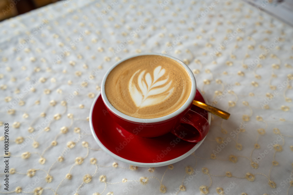 delicious and beautiful double espresso latte at coffee shop in a red mug with beautiful milk design on top of white cloth