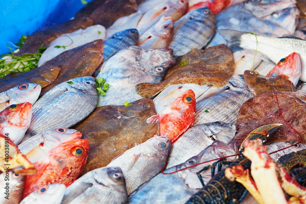 Catch of the day on a traditional Moroccan market (souk) in Essaouira, Morocco