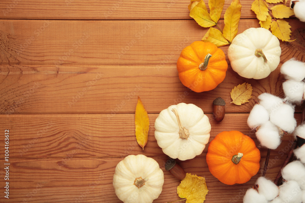 Autumn composition. White and orange pumpkin with autumn leaves on wooden background. Thanksgiving day