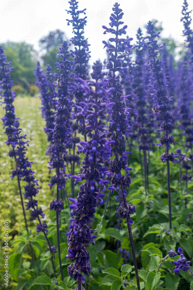 Close up of a beautiful blue Salvia Farinacea flower blooming in an outdoor garden.