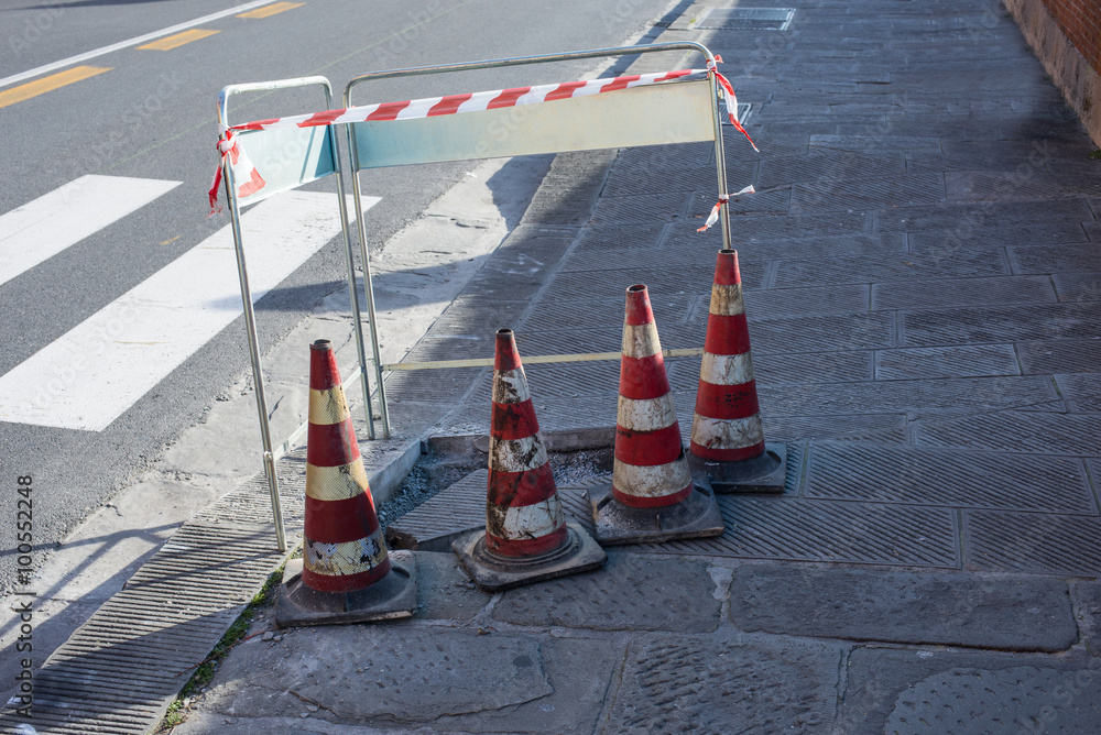 Segnali rifacimento strada, lavori in corso, lastricato buca