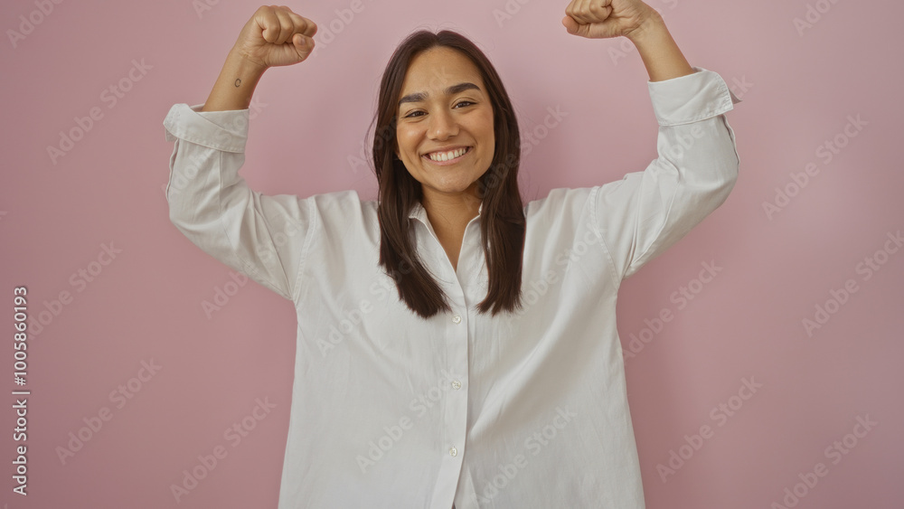 Beautiful young hispanic woman in white shirt over isolated pink background making a strong gesture with her arms, smiling confidently and looking at the camera