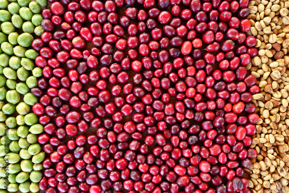 Coffe beans and fresh berries beans backgourng.