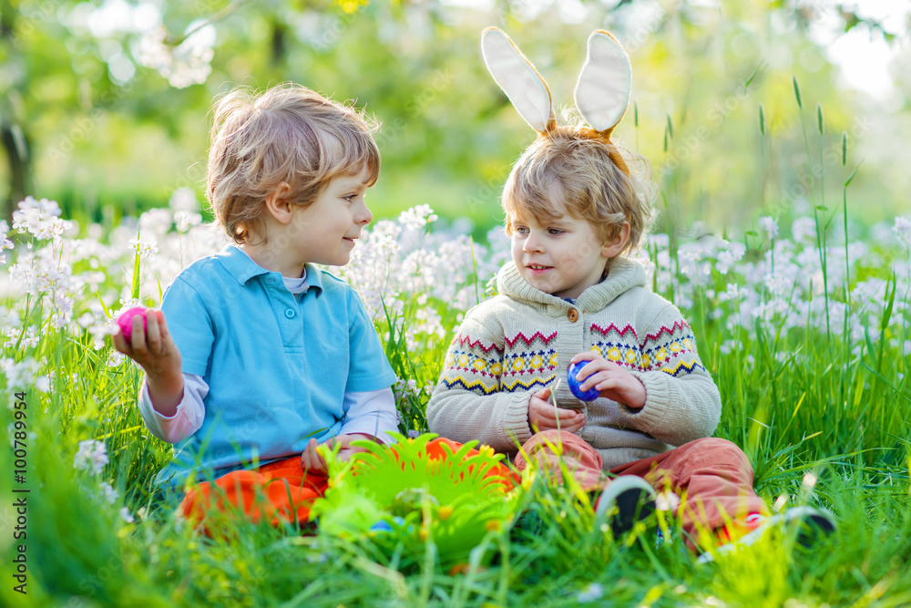 Two little kid boys on Easter during egg hunt