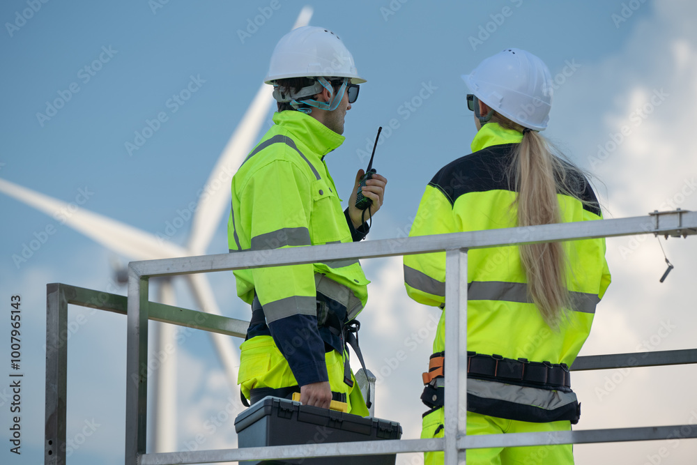 Maintenance engineer team standing at windmills at wind turbine farm. Group of people wear safety helmet and uniform working at alternative renewable energy wind station. Sustainable energy technology