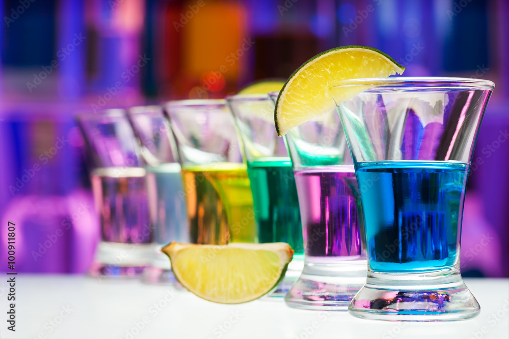 Long perspective row of shots with color drinks