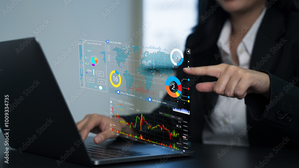 Busines using a computer to complete Individual income tax return form ai online for tax payment. Various financial documents, graphs, reports.