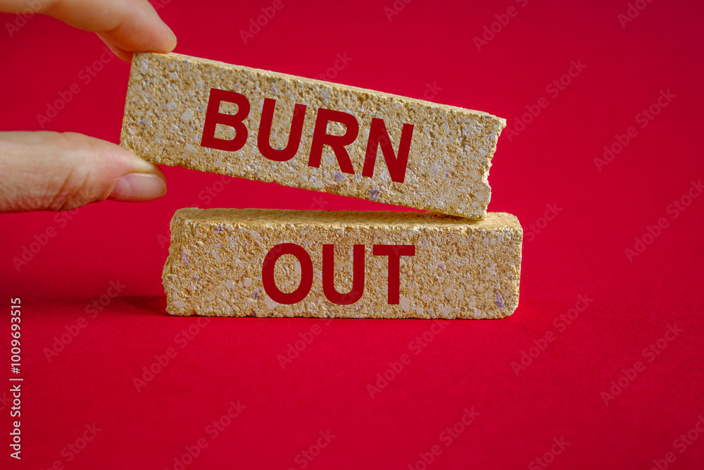 Burn out symbol. Concept words 'burn out' on brick blocks. Beautiful red background. Businessman hand. Business concept.
