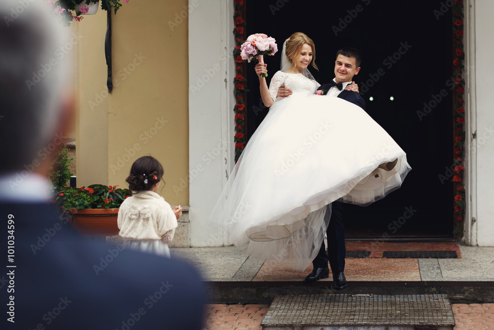Handsome groom in suit carrying stylish elegant blonde bride out