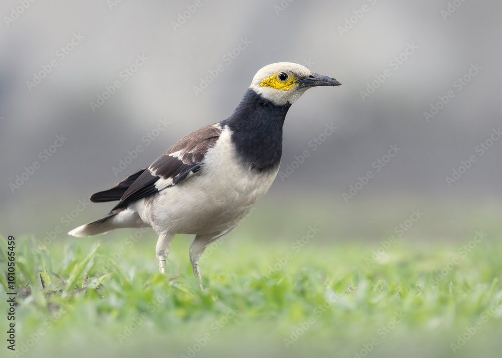 Portrait of a wild black-collared starling (Gracupica nigricollis) standing in grass, Bangkok