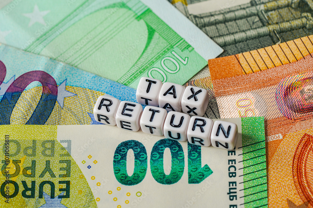 Small beads with text Tax Return on a pile of euro banknotes, closeup detail