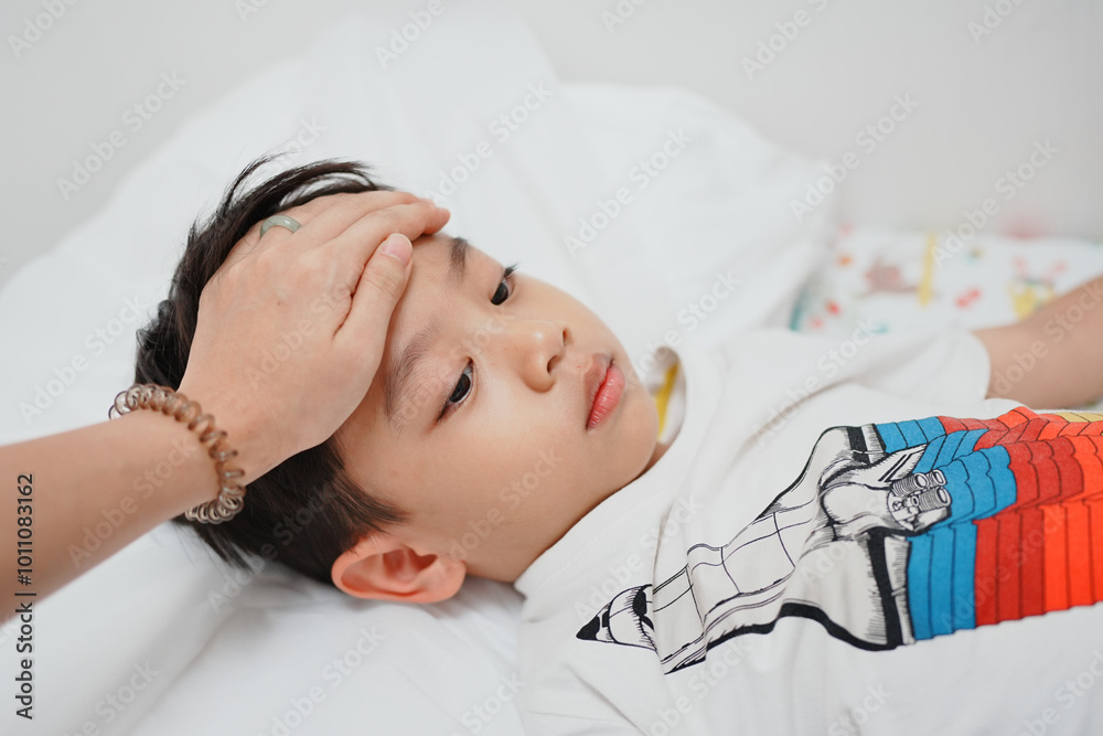 A young boy lies in bed while a hand checks his forehead for fever, showcasing care and concern in a nurturing environment.