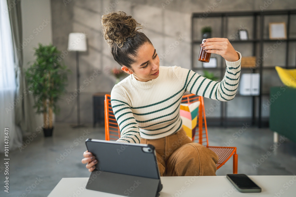 woman hold medicine drugs vitamin supplement bottle pills read label