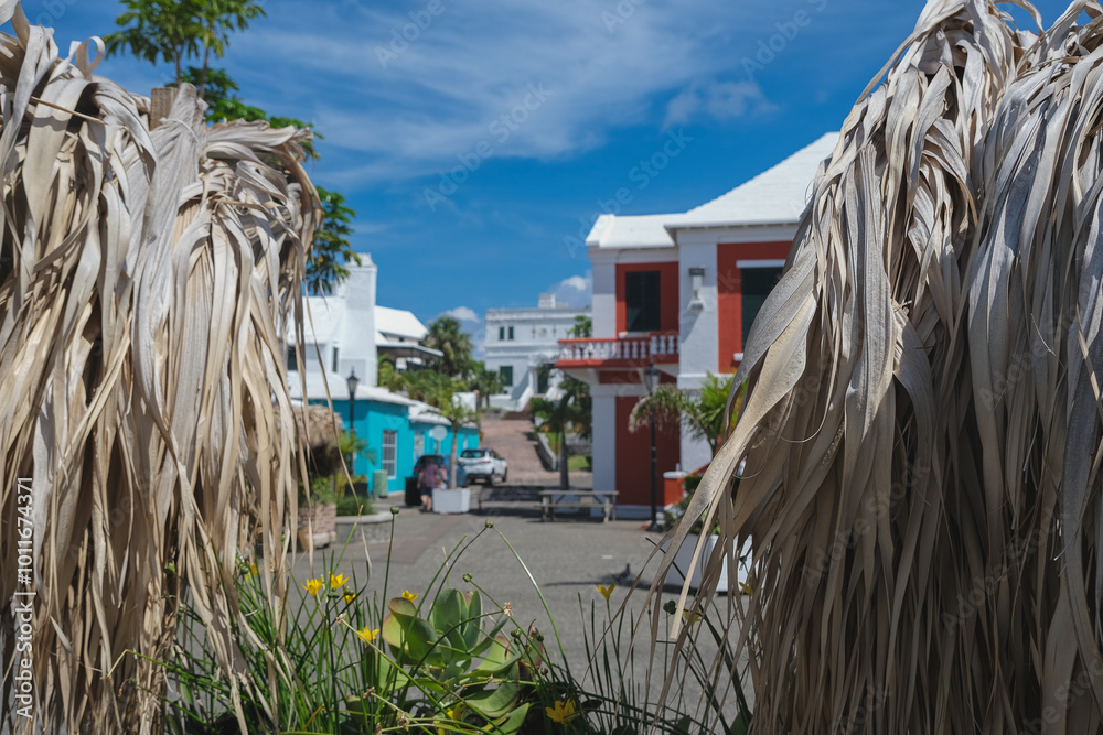 Picturesque old town historic building St. George city skyline cityscape with lush tropical gardens, parks, old backstreets and back alleys Caribbean paradise island Bermuda