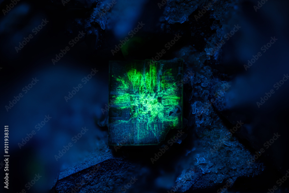 Green Metatorbernite under short wave UV. Specimen from Margabal Mine, Entraygues-sur-Truyère, Aveyron, France. Micro photography extreme close-up. microscope mineral crystal for Scientific use