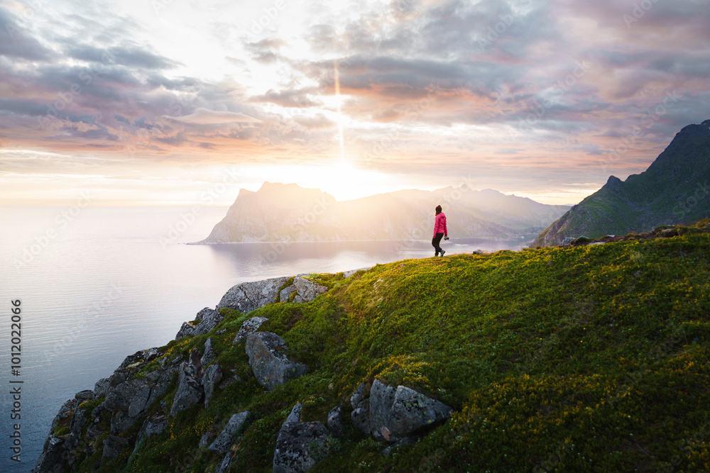 Breathtaking view of a young woman climber hiking on cliff over a stunning fjord landscape during a vibrant sunset or sunrise