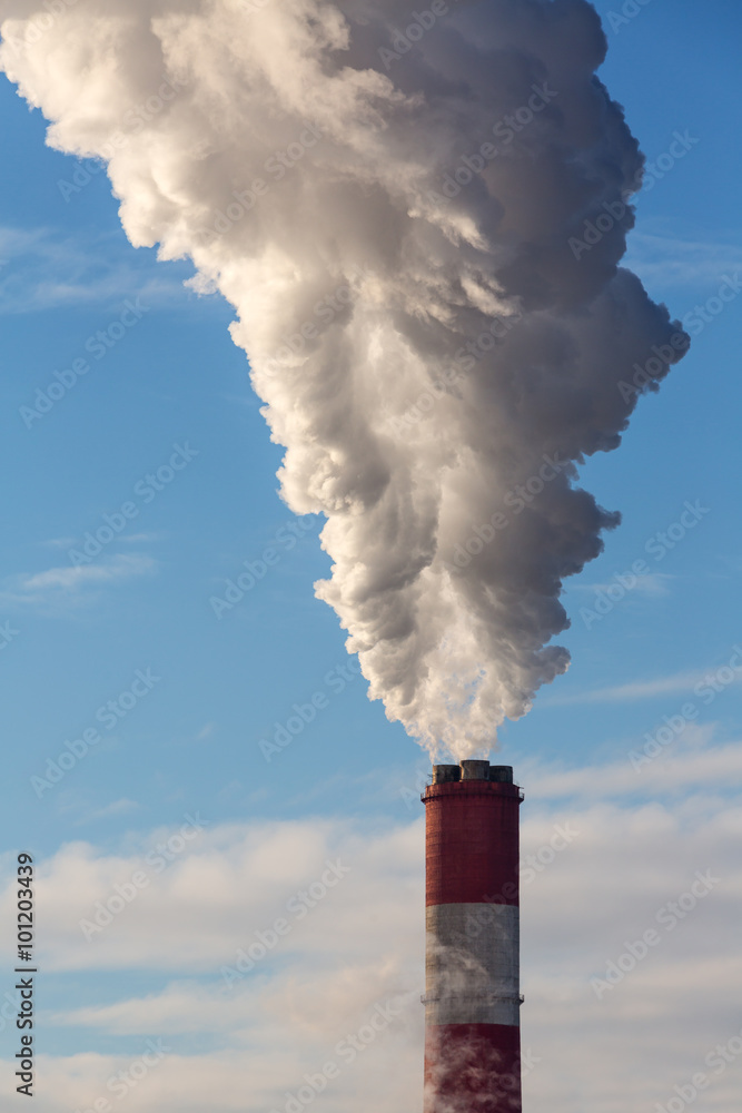 White smoke clouds from a high heating plant chimney