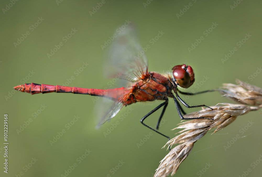 Close-up of a red damselfly (Sympetrum striolatum) sitting on a dry blade of grass. The background is green. The insect is photographed from the side.