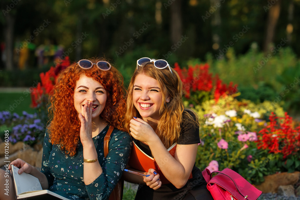 Girlfriends students laugh in the park.