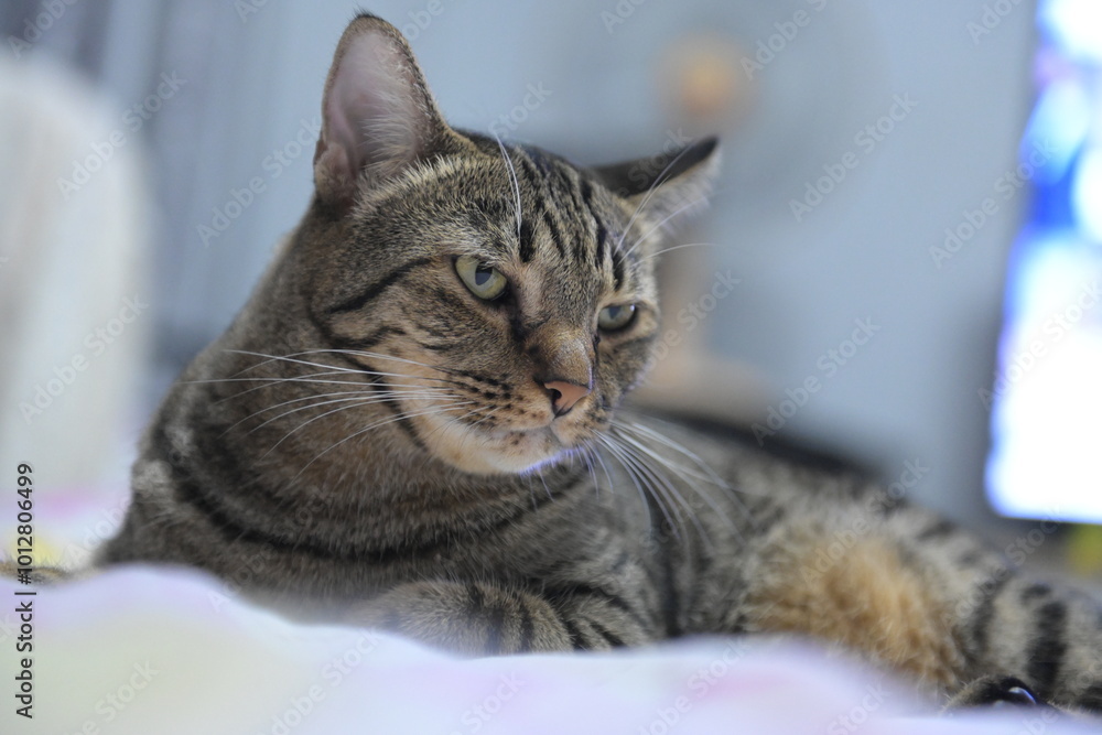tabby cat on bed relax