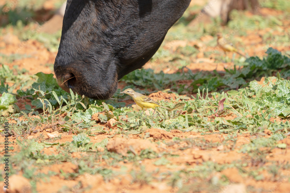 ganado bobino pastando en el campo con pajarillos a su alrededor en Campos mallorca