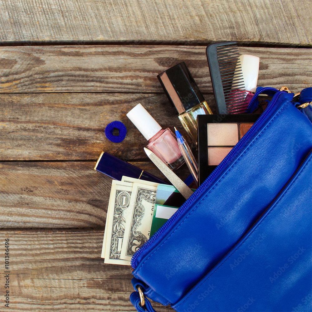 Things from open lady handbag. women's purse on wood background. Cosmetics, money and women's accessories fell out of the blue handbag.