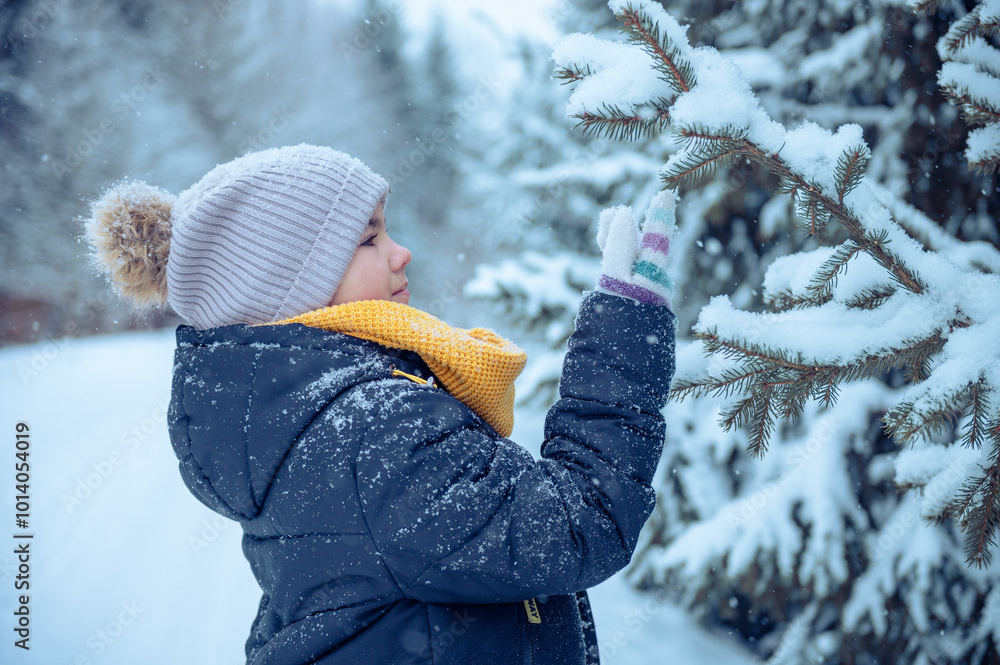 happy girl actively plays outside during the day. in winter looking at the snow on a spruce branch