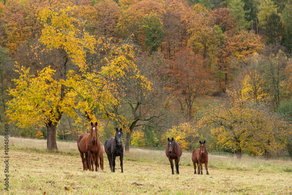 Pferdeherde vor dem Herbstwald