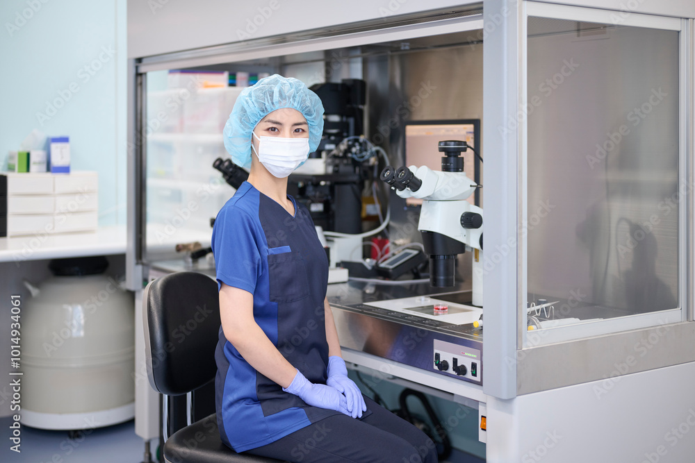 培養室で顕微鏡を使うマスク姿の若い女性培養士