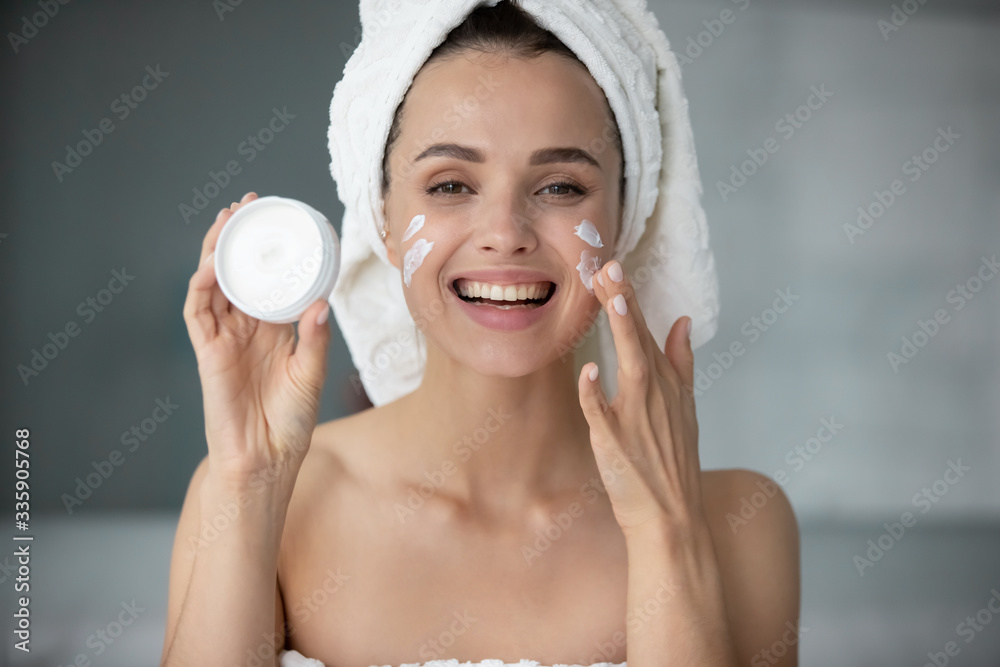 A beautiful woman asia using a skin care product, moisturizer or lotion and Skincare taking care of her dry complexion. Moisturizing cream in female hands