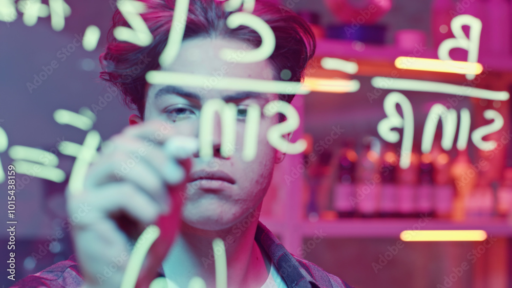Young man solves mathematical equations on blackboard. Media. Young man solves complex equations on transparent board. Genius writes equations on blackboard in neon light
