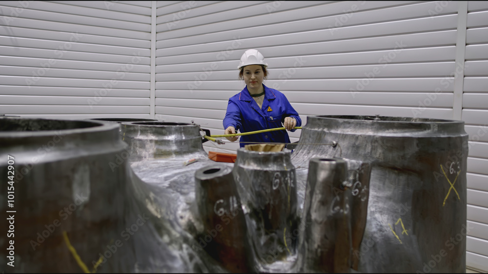 Female worker measures metal structure. Stock clip. Woman in hard hat takes measurements of metal part at factory. Female worker at metalworking plant
