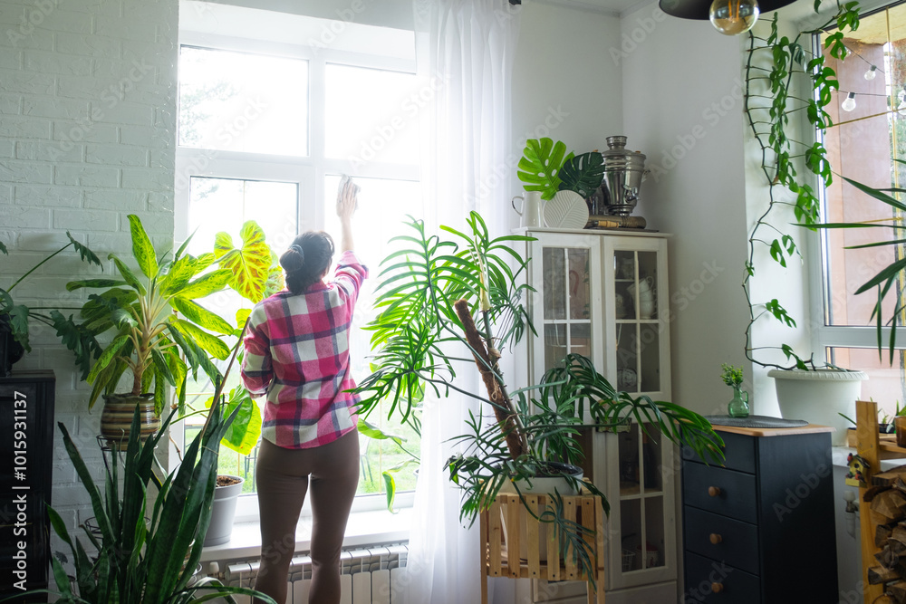 Woman manually washes the window of the house with rag cleaner and mop inside the interior with white curtains and home plants. Restoring order and cleanliness in the spring, cleaning servise