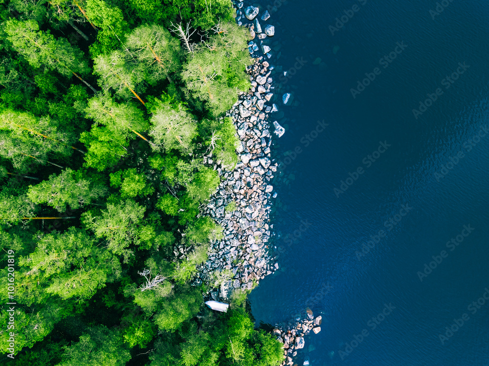 Aerial view of blue water lake with stone coast and green summer woods in Finland