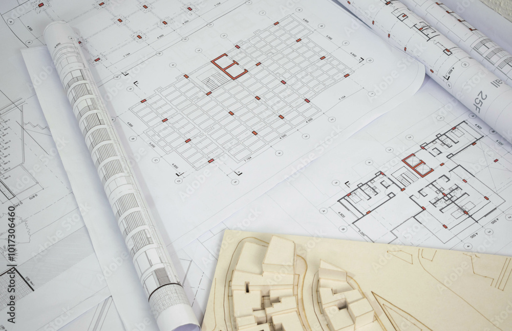 Architectural and structural drawings background. Rolled up plans with scale architectural model