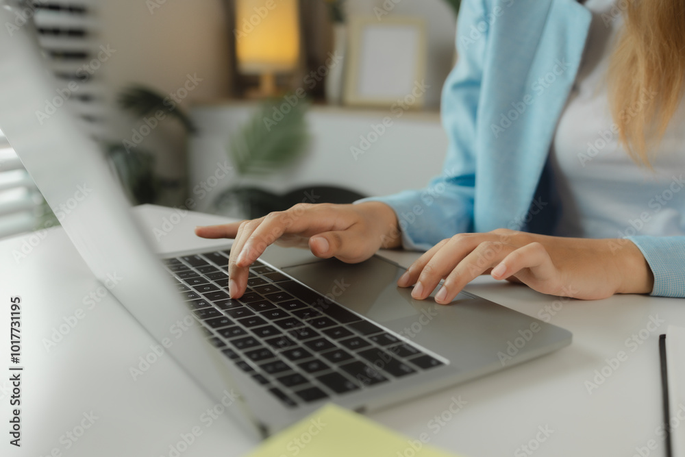 a businesswoman is working in her office at workplace, an employee works at the desk about new project, close up at woman hands, working at her desk in work hours.