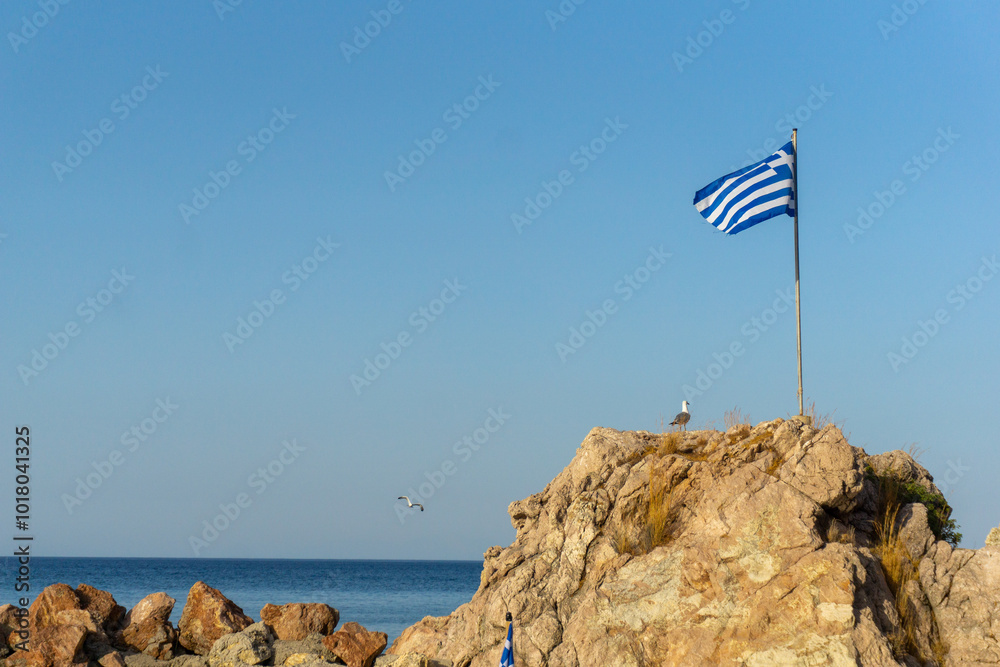 Gabbiani su una scogliera di Rodi, con la bandiera delle Grecia che sventola