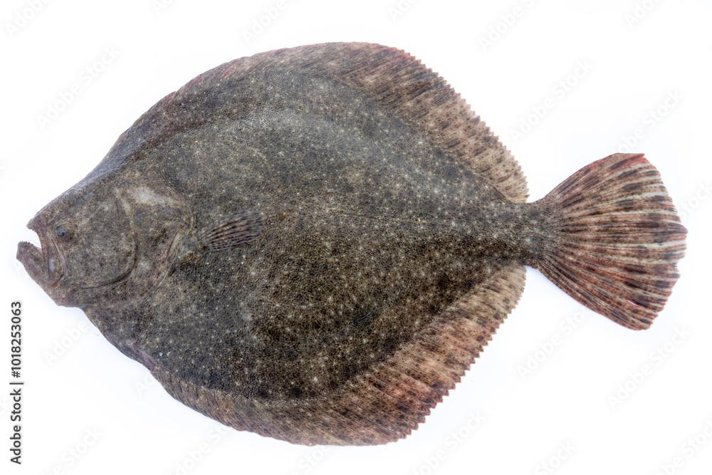Black Sea turbot (Psetta maeotica) demersal fish. Azov smaller subspecies of flounder Scophthalmus maeoticus torosus adapted to fine-sanded bottom, adaptive behaviour, disruptive coloration. Isolated