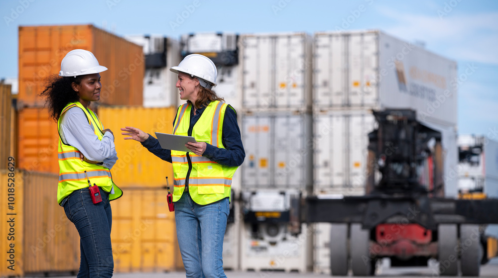 Engineer or dockworker working in the construction container dock yard checking and inspection containers data on computer program environment is container shipping Logistics business concept.